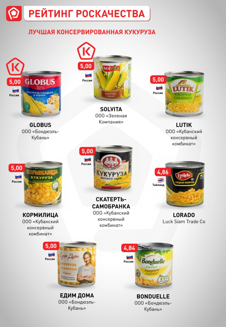 Высшую оценку экспертов 5.0 получила кукуруза марок GLOBUS, «Кормилица», «Скатерть-самобранка», «Едим дома» SOLVITA, LUTIK. Также хорошей оказалась кукуруза LORADO (4.86) и BONDUELLE 4.84).